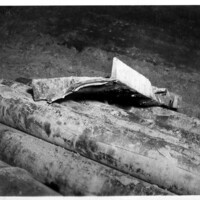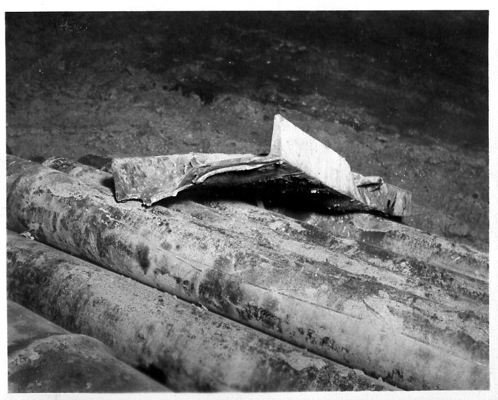 - en-CA Part of the measuring pocket which was torn off after an unexploded dynamite stick went off, in this compartment