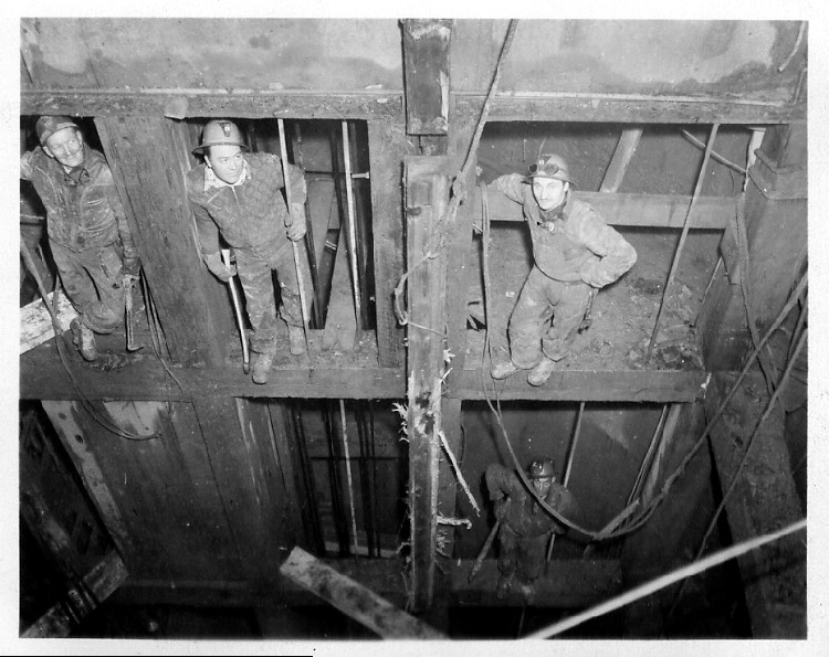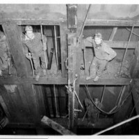- en-CA ... riggers readying the cage to bring it to the surface with the help of the crane (Man on right is Joseph Giagnorio)