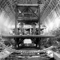 - en-CA Pumpcrete gantry riding on tracks laid on 12 x 18 timbering which was secured in invert