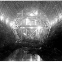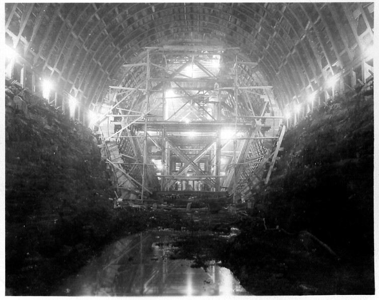 - en-CA Concrete form 80 feet long by 45 feet diameter. Notice bulkhead facing you at junction of form with rock