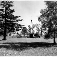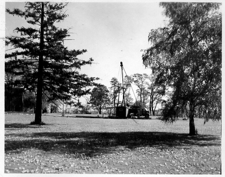 - en-CA Well-drillers at work. An 18 inch hole was bored through the surface straight down to the tunnel below, averaging from 290 ft to 350 ft in depth, depending on the location. These holes were bored at 400 ft. intervals, following the contour of the tunnel below. A 10" steel pipe was then inserted for the full length of the hole. This pipe in turn was used to drop the concrete to a hopper in the tunnel which in turn transferred it to the pumpcrete machines