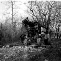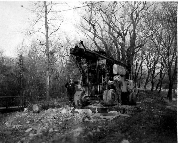 - en-CA Well-drillers at work. An 18 inch hole was bored through the surface straight down to the tunnel below, averaging from 290 ft to 350 ft in depth, depending on the location. These holes were bored at 400 ft. intervals, following the contour of the tunnel below. A 10" steel pipe was then inserted for the full length of the hole. This pipe in turn was used to drop the concrete to a hopper in the tunnel which in turn transferred it to the pumpcrete machines