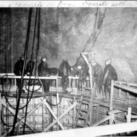 - en-CA Concrete crew pouring the ring through an elephant trunk. Top view of ring showing wooden form as well as re-inforcing steel work. Just about completed and ready for pouring