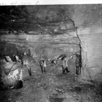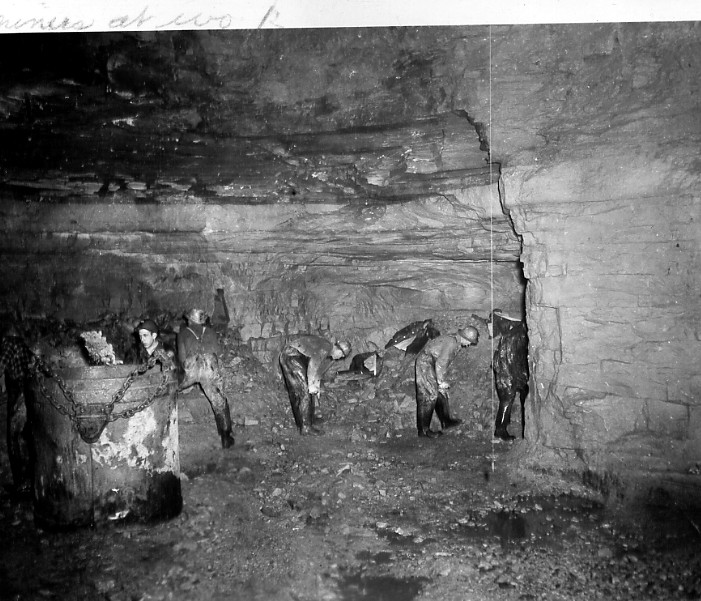 - en-CA Notice rock formations in the bottom picture. The men working in this picture are actually in the crosscut section while the photographer stood in the centre of the shaft
