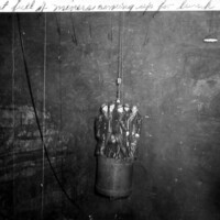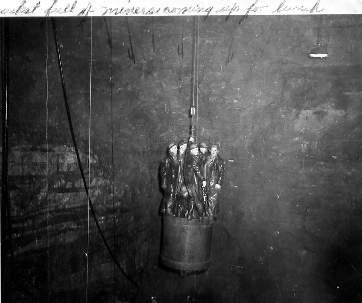 - en-CA 5 ft diamter muck bucket loaded with miners coming up 350 ft to surface for lunch