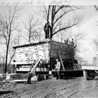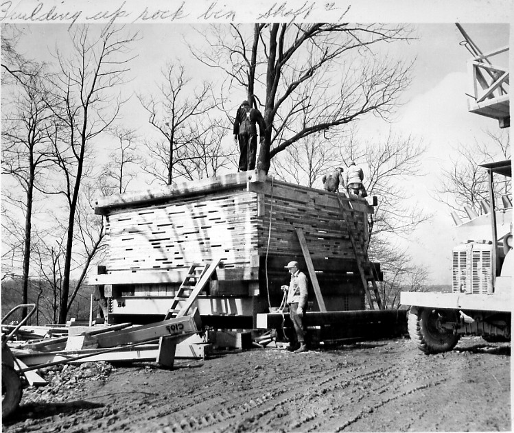 - en-CA Permanent rock bin being constructed on the ground. Notice scattered joints of 2 x 12 planks in the construction of this bin. The reason for this is merely economy of material