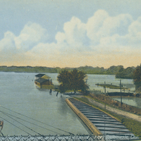 - View from the grandstand out over the course ; docks and slipway in foreground ; boat house at end of dock ;