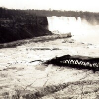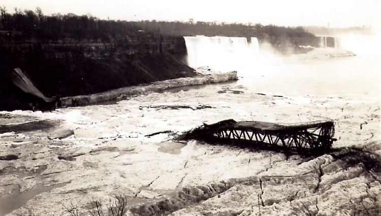 - en-CA A massive ice jam in January 1938 brought down the Upper Steel Arch Bridge. Traffic on the bridge was halted at 4 a.m. on January 27 and a death watch began. In this postcard we see the last remaining section of the bridge. Bruce Leslie wrote in the Niagara Falls Review "at 9:30 o'clock the whole ice jam surrounding the rest of the wreckage shifted. Huge channels of water appeared ...At about 3:45 o'clock the final section broke away and floated down river...As it floated down river those watching on the gorge bank had to run to keep up with the speed of the river current moving the massive piece of ice which carried what remained of the bridge. It sank into the water opposite Otter Street on the Canadian side and Elmwood Avenue on the American side