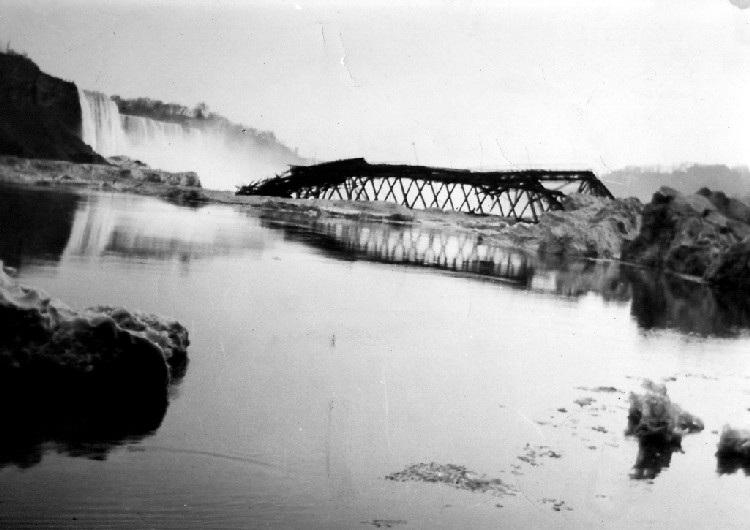 - en-CA A massive ice jam in January 1938 brought down the Upper Steel Arch Bridge. Traffic on the bridge was halted at 4 a.m. on January 27 and a death watch began. Here we see the last remaining section of the bridge. Bruce Leslie wrote in the Niagara Falls Review "at 9:30 o'clock the whole ice jam surrounding the rest of the wreckage shifted. Huge channels of water appeared ...At about 3:45 o'clock the final section broke away and floated down river...As it floated down river those watching on the gorge bank had to run to keep up with the speed of the river current moving the massive piece of ice which carried what remained of the bridge. It sank into the water opposite Otter Street on the Canadian side and Elmwood Avenue on the American side