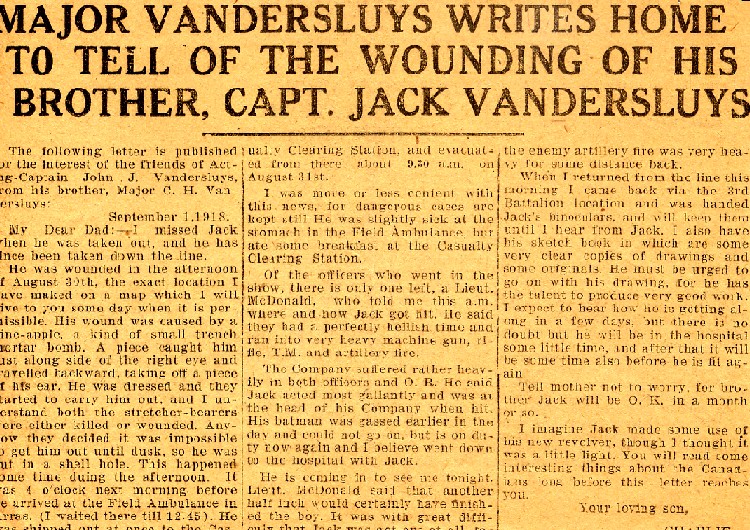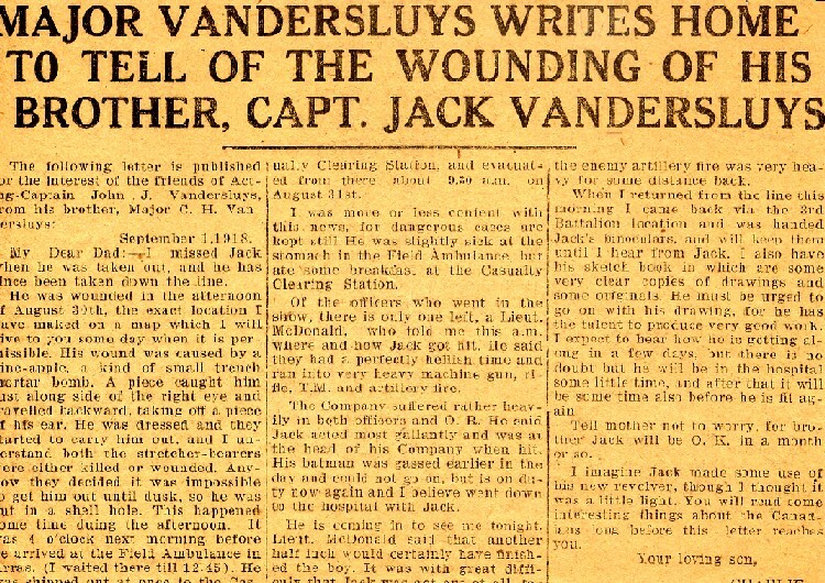 - Major Vandersluys writes home to tell of the wounding of his brother Capt. Jack ...