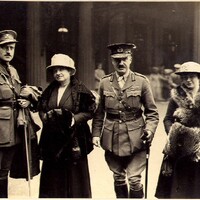 - hand written on back Enroute to Buckingham Palace Gen. Hill decorated by King. L=>R Adjutant, Mrs Hill, Major General F W Hill, Isobel Louise Hill (daughter)