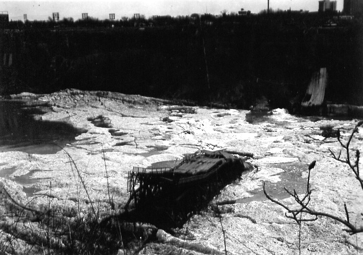 - en-CA A massive ice jam in January 1938 brought down the Upper Steel Arch Bridge. Traffic on the bridge was halted at 4 a.m. on January 27 and a death watch began. Here we see the last remaining section of the bridge. Bruce Leslie wrote in the Niagara Falls Review "at 9:30 o'clock the whole ice jam surrounding the rest of the wreckage shifted. Huge channels of water appeared ...At about 3:45 o'clock the final section broke away and floated down river...As it floated down river those watching on the gorge bank had to run to keep up with the speed of the river current moving the massive piece of ice which carried what remained of the bridge. It sank into the water opposite Otter Street on the Canadian side and Elmwood Avenue on the American side ;