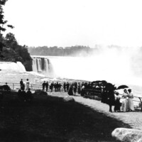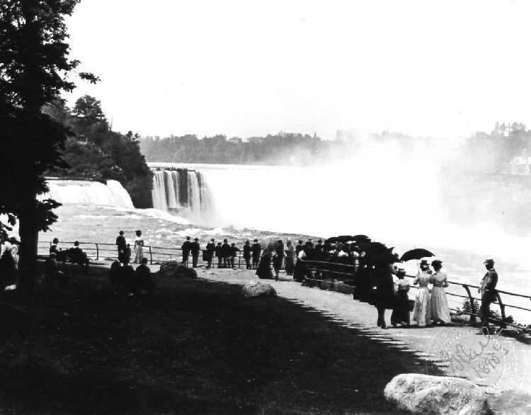 - Tourists admiring the American Falls from Prospect Point on Goat Island