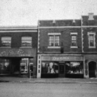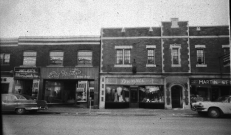 - en-CA (Left to right): 'Helen's Millinery & Specialty Shop', 'Dunn's Fine Tailored Clothes' and 'Martin-Senour Paints'.