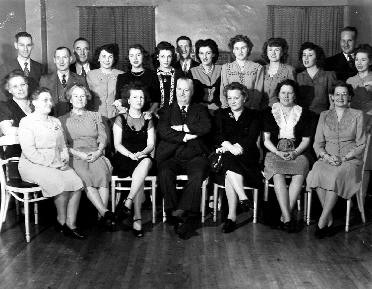 - digital image from an original photograph ; John Ward centre, his wife Ruth to right ; it is unknown at which of the movie houses this staff group photgraph was taken ;