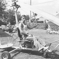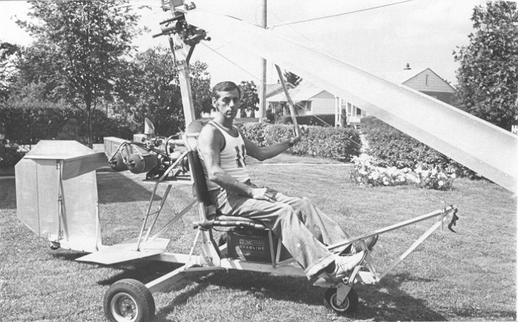 - en-CA Theo Andrews sits on his home made gyrocopter on his front lawn on Hawkins Street in Niagara Falls