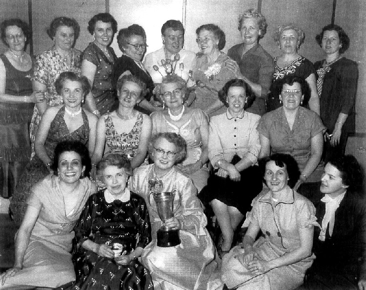 - en-CA From the personal collection of Marion Irvine ; Front Row L-R: Lillia Salci, Alma Williams, Kay O'Neil, Lois Hawkins, Lillian Roberts ; Middle Row: Audrey McPherson, Dorothy Hawkins, Elsie Hawkins, Ada Barr, Marion Irvine ; Back Row: Gwen Sexsmith, Dorothy Dracup, Lillias Buchanan, Leah Hamilton, Peggy McLachlin, Jessie Fisher, Marguerite Downing, Grace James, Mary Lou Methner ;