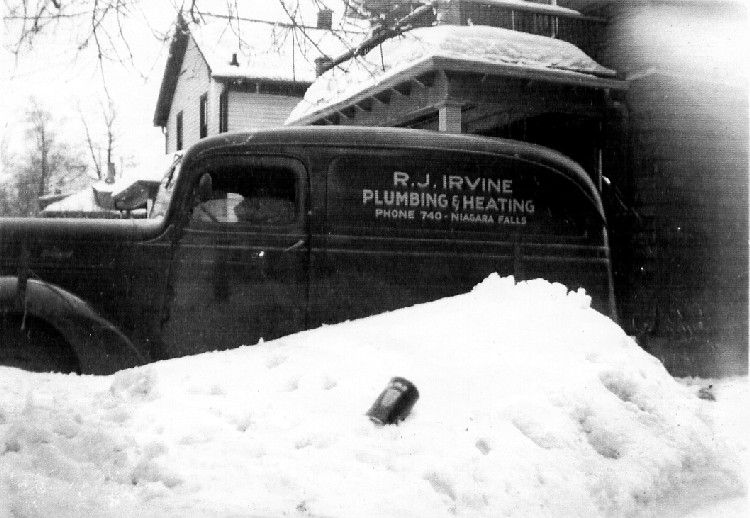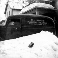 Truck belonging to R J Irvine Plumbing and Heating on Highland Ave 1940s
