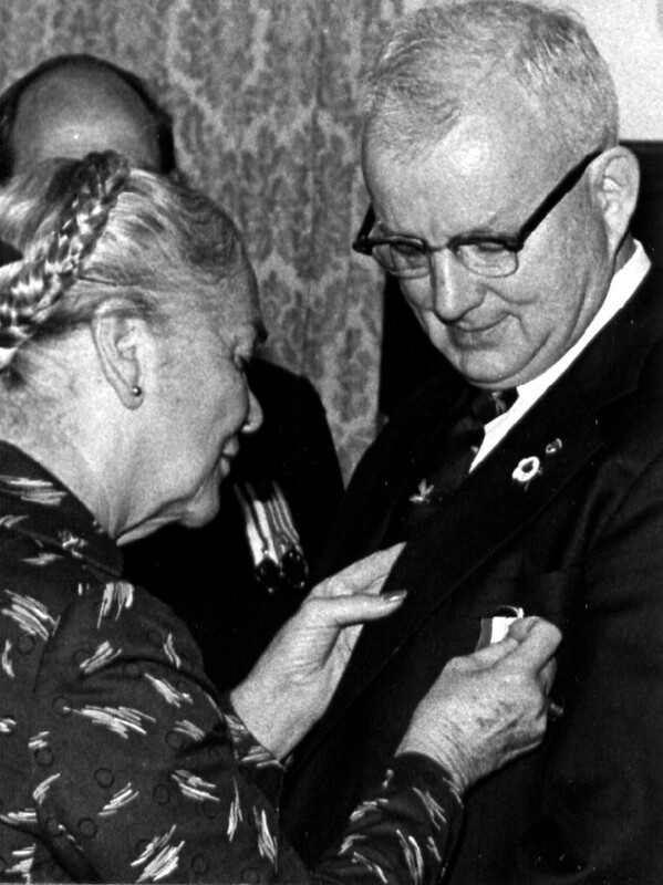 Malcolm S (Mac) Bowman 1921 - 1981 Swimming coach receiving an award from Pauline McGibbon