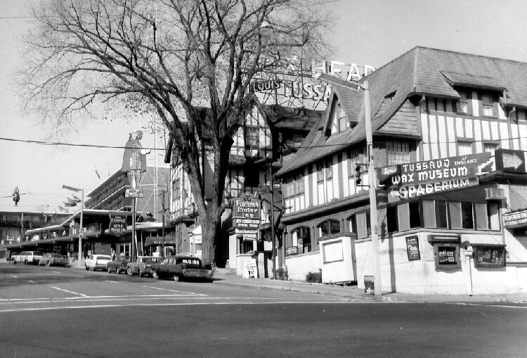Looking up Clifton Hill, Foxhead Inn, Louis Tussaud Wax Museum right, statue of Blondin suspended