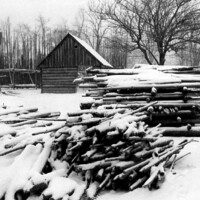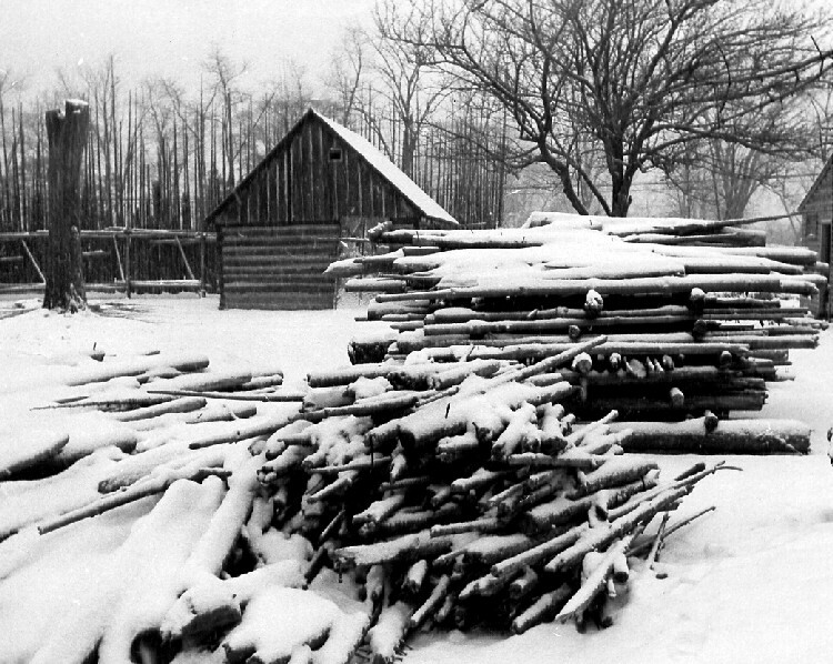 - Winter image of replica of Indian Camp (Village) built by Murray Ruta on Portage Rd