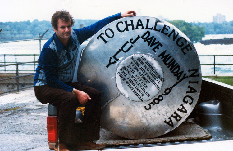 - John "David" Munday with barrel used in a foiled attempt to go over the Horseshoe Falls 1985