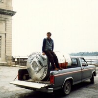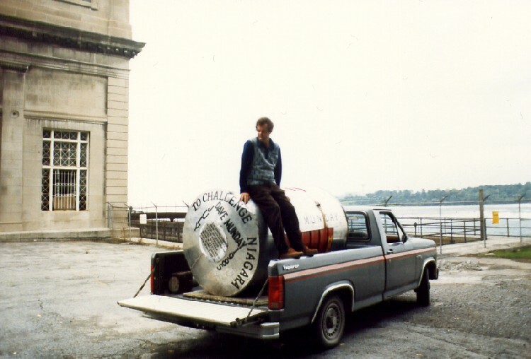 John "David" Munday with barrel used in a foiled attempt to go over the Horseshoe Falls 1985