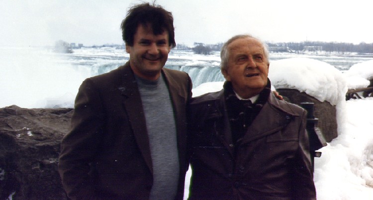 - John "David" Munday shown with City Historian George Seibel at the brink of the Horseshoe Falls