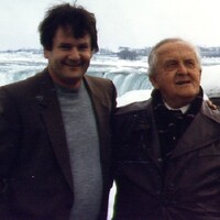 John "David" Munday shown with City Historian George Seibel at the brink of the Horseshoe Falls