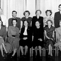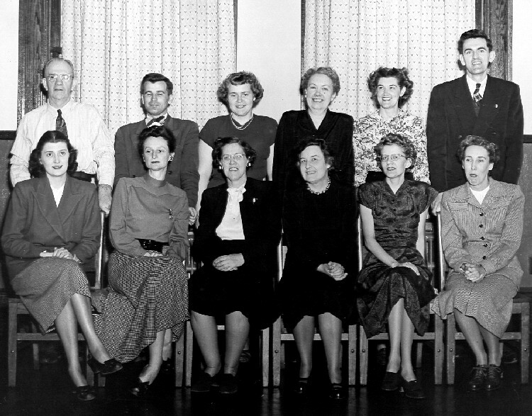 - en-CA L-R: Front row: Helen Sehl Branch Librarian, Grete Nelson, Ruby Wallace Chief Librarian, Edith Goodsir, Edith Albrant, Helen Lothian ; Back Row: W J Sinclair (janitor), Dan Alchuck, Frances Stokes (part-time), Eva Vanalter? (part-time), Kathryn Smith, Michael Donovan ;