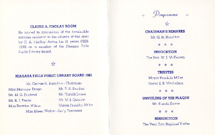 - Programme of dedication of Claude A Findlay Room at Niagara Falls Public Library