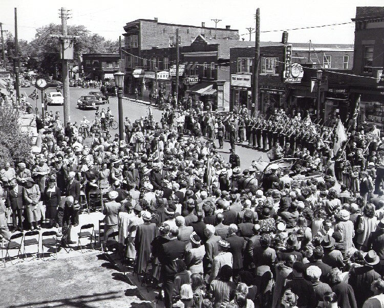 Stores L-R Main Coffee Shop, Whiteheads Market, Agnew Surpass Shoes, Berger's Restaurant, Bryden Bros Jeweler, The Boot Shop, Magder's, R McAlpine's Jewellers, Campbell's Lunch, portion of Munroe & Zavitz Hardware extreme right