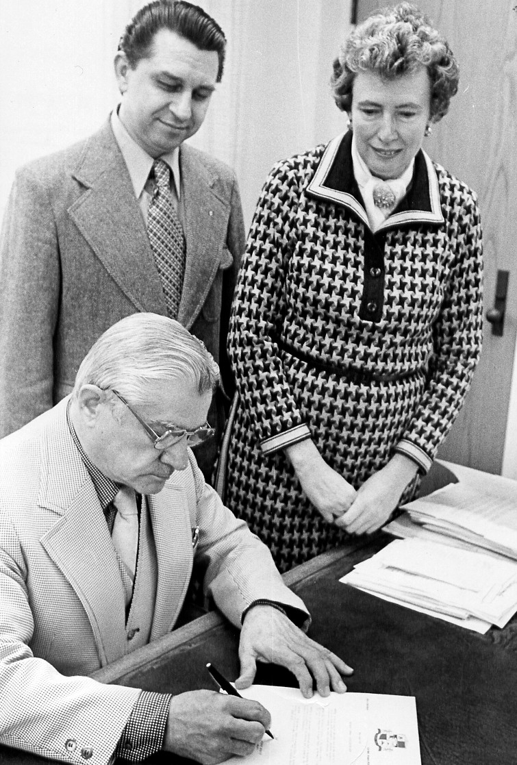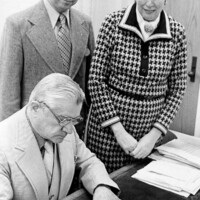 - L-R: seated Mayor George Bukator, unidentified male, Dorothy Van Slyke