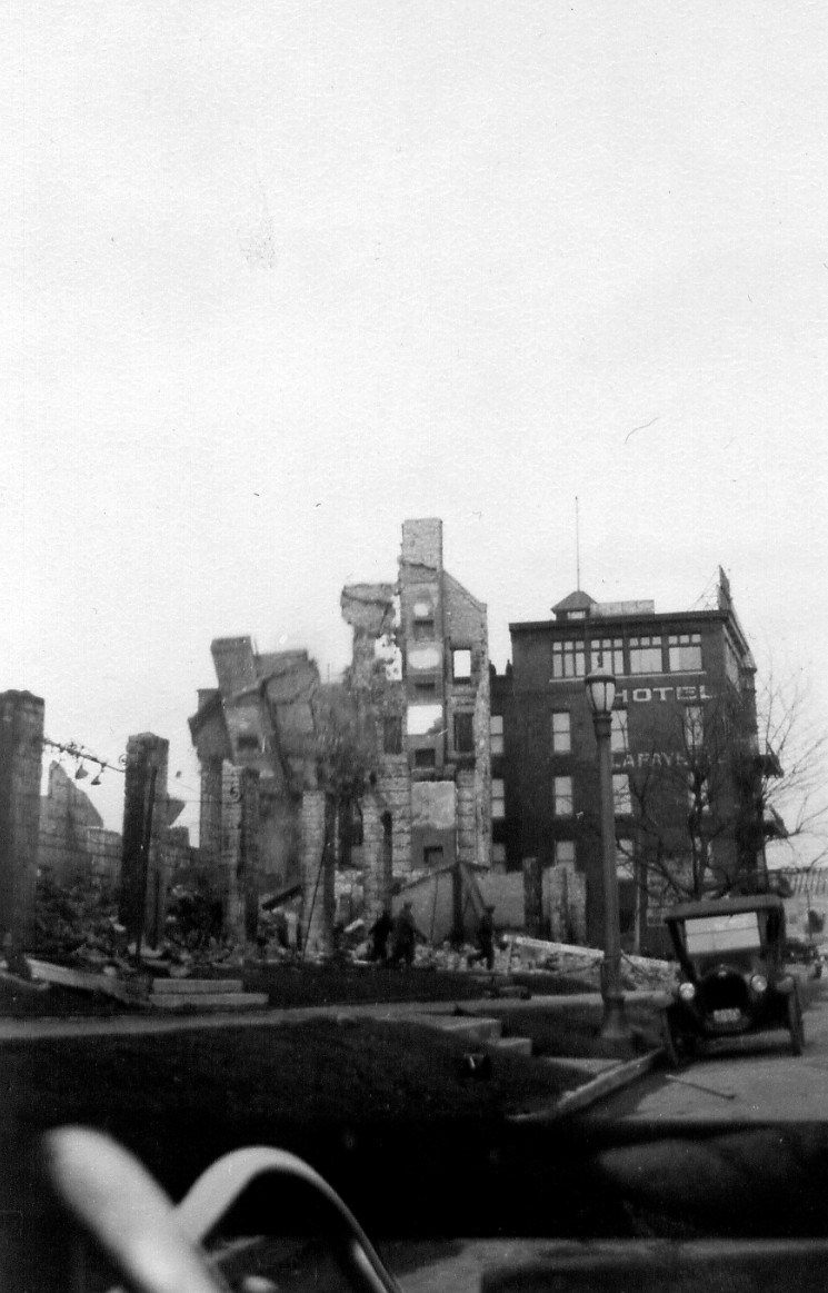 Ruins of the Clifton Hotel after the fire December 31 1932, Lafayette Hotel in background
