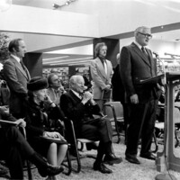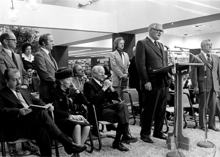 - en-CA Front Row L-R: The Honourable John Clement MPP, Mrs Michener, The Right Honourable Roland Michener Past Governor General of Canada, George H Hamilton at microphone, Mayor George Bukator ; Second Row: L-R: H G Kirley, Dr W H Ainslie members of Niagara Falls Public Library Board, Dr Parr, V J Huxtable ; standing in rear Dorothy Van Slyke Chief Librarian ;