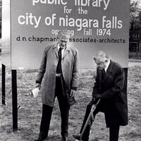 - L-R: George H Hamilton Chairman Niagara Falls Public Library Board, Mayor George Bukator