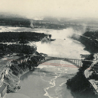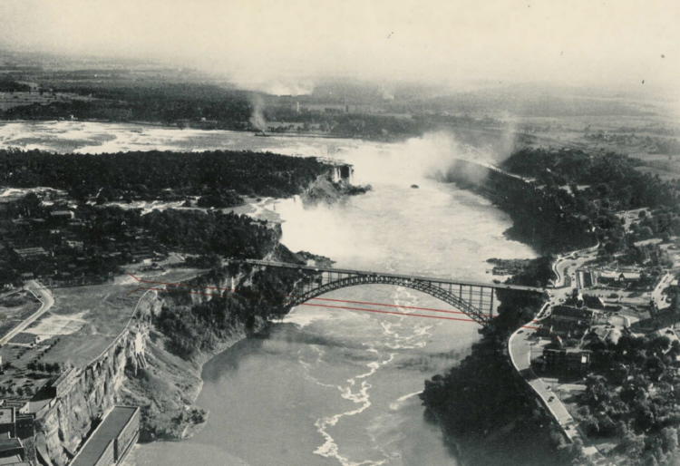 - en-CA Red Lines Indicate Proposed Location of the Niagara Falls Observation Bridge approximately 600 feet north of the collapsed International Railway Co. Bridge