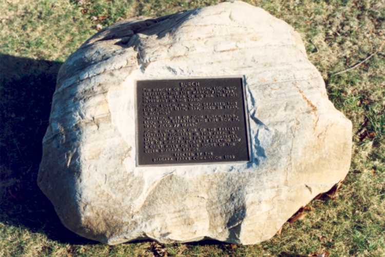 - en-CA Inscription reads Burch "In Memory of John Burch, ESQ, who departed this life March 7th, 1797 in the 55th year of his age, the first interment in this yard. John Burch Jr who departed this life August 15th, 1822, aged 38 years 5 months. Martha wife of John Burch Senr, Esq, who departed this life Nov 28 1823 aged 77 years. John Burch was one of the earliest Loyalist pioneers in this area. In 1786 he made the first commercial use of Niagara power by erecting saw and grist mills on the shore of the Greater Niagara Rapids. Erected by the Niagara Parks Commission 1989 ;