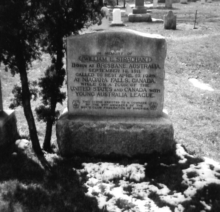 - en-CA The headstone notes that William Strachan died suddenly whilst touring Niagara Falls with the Young Australia League, the headstone was erected in his memory by the Boys Club Federation of America ;
