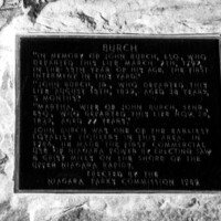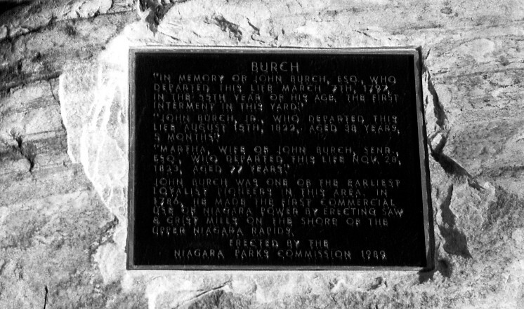 - en-CA Inscription reads Burch "In Memory of John Burch, ESQ, who departed this life March 7th, 1797 in the 55th year of his age, the first interment in this yard. John Burch Jr who departed this life August 15th, 1822, aged 38 years 5 months. Martha wife of John Burch Senr, Esq, who departed this life Nov 28 1823 aged 77 years. John Burch was one of the earliest Loyalist pioneers in this area. In 1786 he made the first commercial use of Niagara power by erecting saw and grist mills on the shore of the Greater Niagara Rapids. Erected by the Niagara Parks Commission 1989 ;