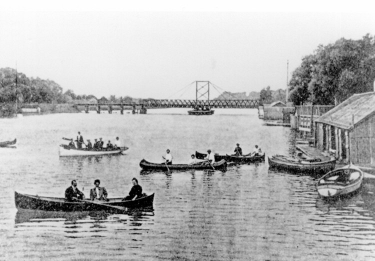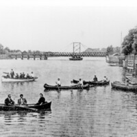 - Five canoes are shown boating in Chippawa Creek, The MCR [Michigan Central Railway bridge is in the background ; Left front canoe inlcudes: Thomas Greenwood, Louise Ackerman, Mrs. Greenwood; Left Upper Canoe: Thomas Downey & unknown; Upper right canoes': Hardy Gerber & Deak Greenwood ; tw small motor boats are shown tied up at the boat house centre right ;
