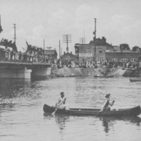 - The winners of the canoe race are shown crossing the line near the Chippawa Bridge ; crowds line the bridge and the bank of the creek ;