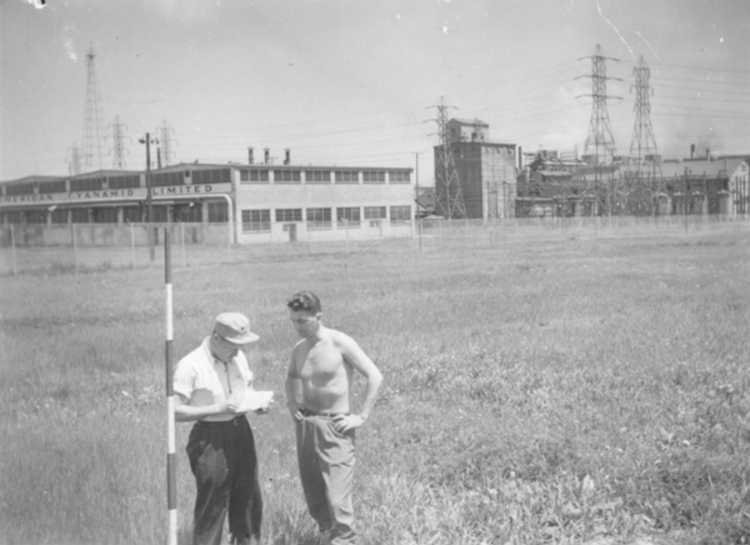 Two Surveyors standing in field adjacent to American Cyanamid Limited