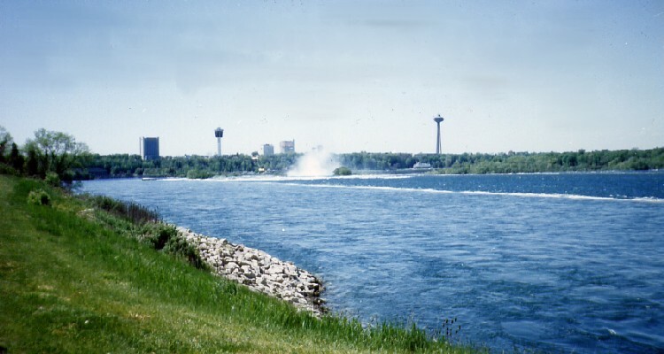 Upper Niagara River - looking toward brink of Horseshoe Falls, Minolta, Skylon Towers