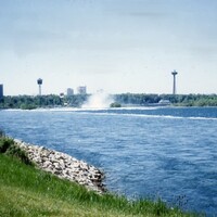 - Upper Niagara River - looking toward brink of Horseshoe Falls, Minolta, Skylon Towers
