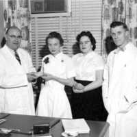 - en-CA Dr. Warminton presents 5 year service awards to 3 members of medical staff - Left to right: Dr. R. G. Warminton, Miss P. Archer, Mrs. J. Pettes, and Dr. W. J. Martin