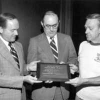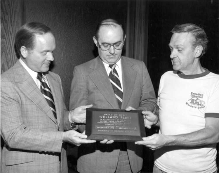 - en-CA - 3 gentlemen: unknown; Award of Merit Welland Plant reads: IN RECOGNITION OF THE SAFETY RECORD WHICH EMPLOYEES HAVE ESTABLISHED BY OPERATING WITHOUT A DISABLING INJURY FOR 1,222,690 MAN HOURS " DECEMBER 9, 1975 - DECEMBER 4, 1976 "