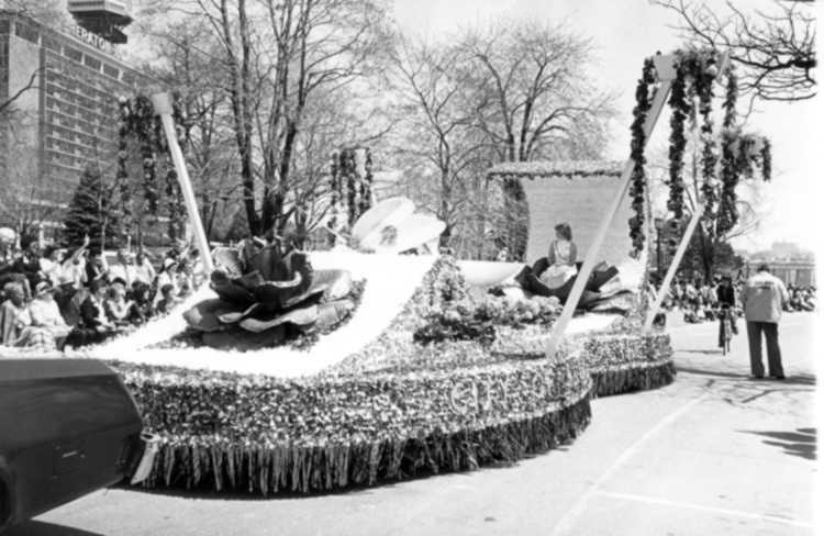 - Miss Blossom Festival sitting on Float ; Sheraton - Foxhead Hotel in background