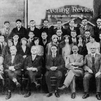 - en-CA First Row L-R: J.I.M. Grant (1923) Book keeper; Winnifred Stokes (19 ) Reporter; P. Haffey (1914) Newspaper Foreman; J. M. Cowan (1915) Editor; F. H. Leslie (1904) President and Manager; D. N. Fielding (1926) Advertising Manager; Mccartney (1921) Advertising Solicitor; C. A. Styles (1925) Superintendent Job Dept.; C. Williams (1923) Newspaper Pressman. Second Row L-R: C. Welstead (1928); G. H. Foster (19 ); L. M. Mudge (1923); Mrs. C. Muirhead (1923); Viola Dawson (1929); Virginia Dawson (1928); N. Cocksedge (1929); Jean German (1928); C. Smith (1926); W. Birke (1927); A. Green (1929) Third Row L-R: W. Sootheran (1929); W. B. Leslie (1928); C. Lindsay (1924); R. J. Sootheran (1924); S. Howarth (1929); P. Lotocky (1929); J. Newns (1926); E. Piigrim (1922); C. Booth (1921); P. Wallace (1926) Fourth Row L-R: J. Taylor (1927); C. MacIntosh (1929); H. Lindsay (1924); A. Dalmer (1925); D. Colbourne (1929); A. Whittaker (1922); R. Connon (1921); H. B. Parr (1916); J. M. Osborne (1912); G. Silver (1929)