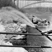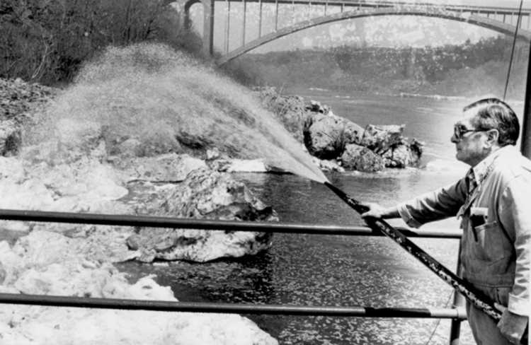 Captain Bud McGinn of The Maid of the Mist, hosing down rocks on the shoreline